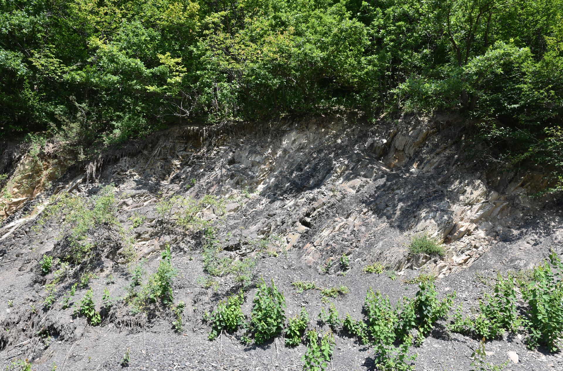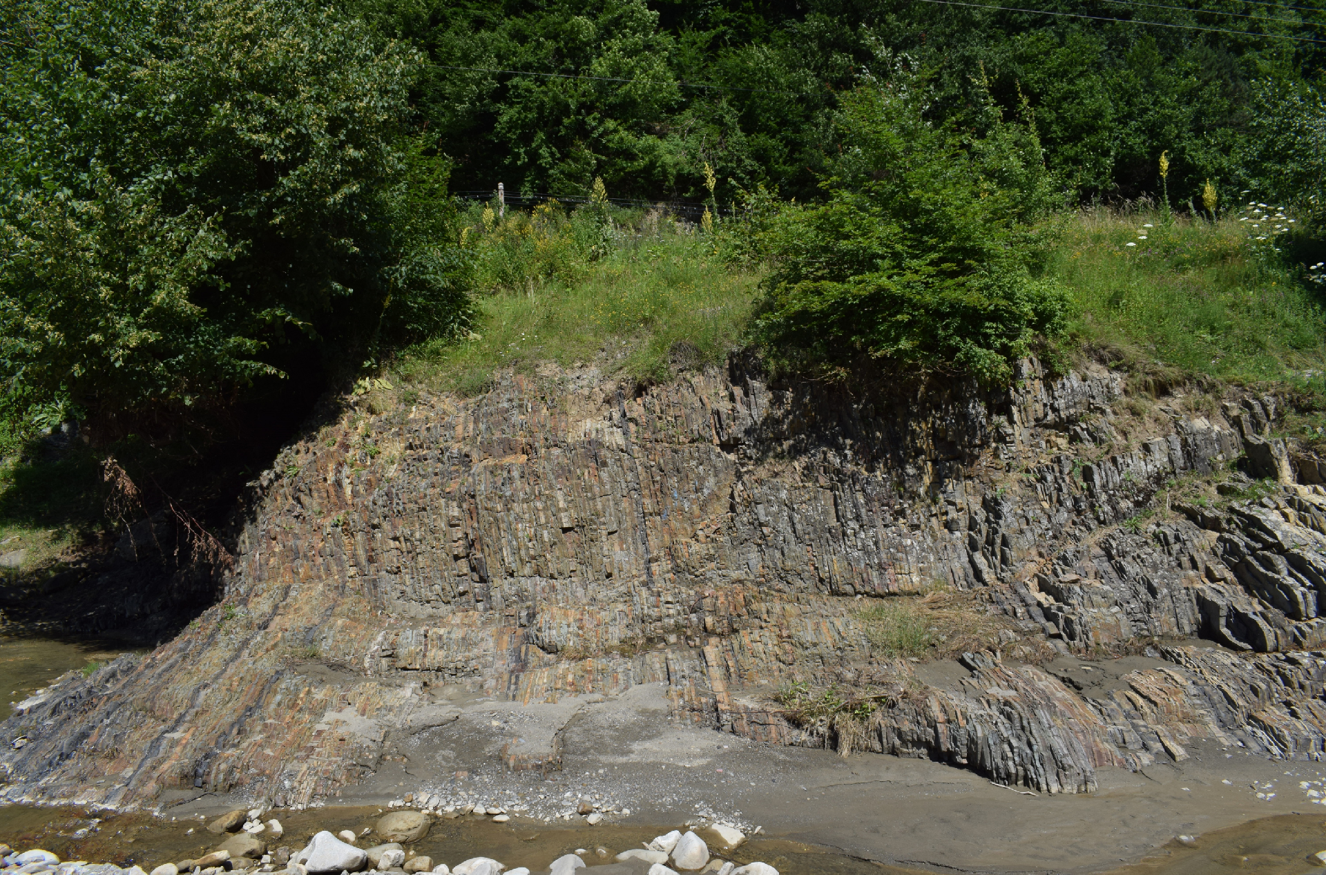 Succesiune de turbidite ale Cretacicului mediu, care conțin nivele cm de argile negre (Valea Ostra, lângă localitatea Stulpicani). Foto Dr. Gabriel Ion, August 2021.