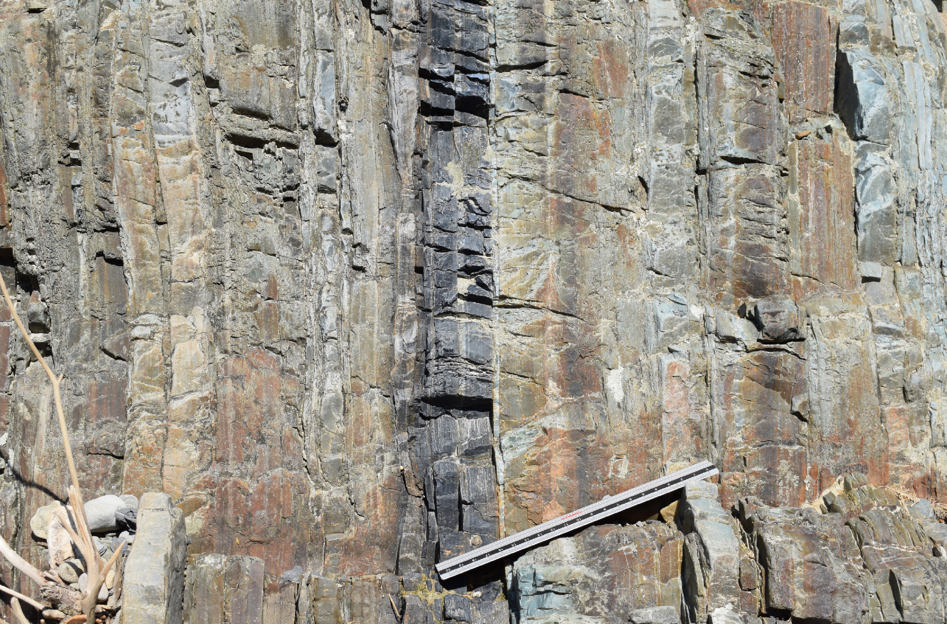 Sedimentele Membrului superior al Formațiunii de Audia din Pânza de Audia la Hangu (malul stâng al Râului Bicaz), în care se pot distinge intervale cm depoziționale anoxice.